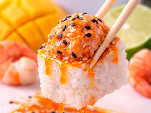 Креветка в темпуре, сливочный сыр, соус Спайси (японский майонез, соус Кимчи, соус Шрирача), соус Унаги, воздушный рис